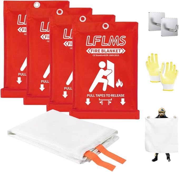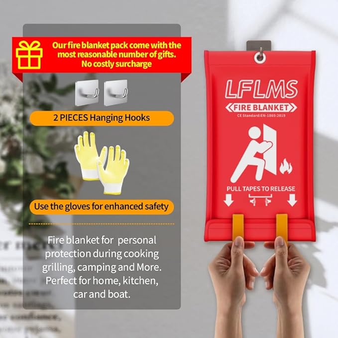 - FIRE BLANKETS EMERGENCY FOR HOME: Our LFLMS Fire blankets can easily extinguish small fires, helping you swiftly and correctly respond to fires, ensuring safety for you and your family. Each pack includes 1 pair of gloves and 2 hooks. Use the gloves for enhanced safety. Two Stainless Steel Hooks for easy hanging on a wall in your kitchen or workshop for quick access.