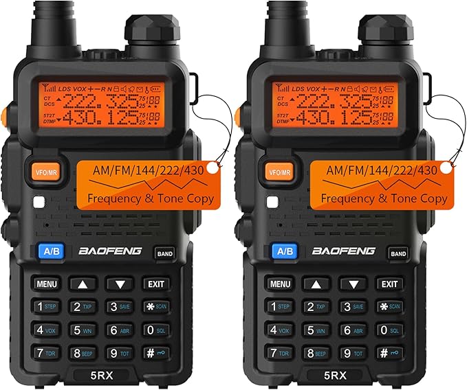- Baofeng handheld 5RX two way radios has a built-in multi-band. Frequency range(MHz) is Transmit: VHF, UHF; Receive: FM, 108-136, 136-174, 220-260, 350-390, 400-520. Meet your needs for different frequency bands. FCC ID: 2AJGM-5RX.