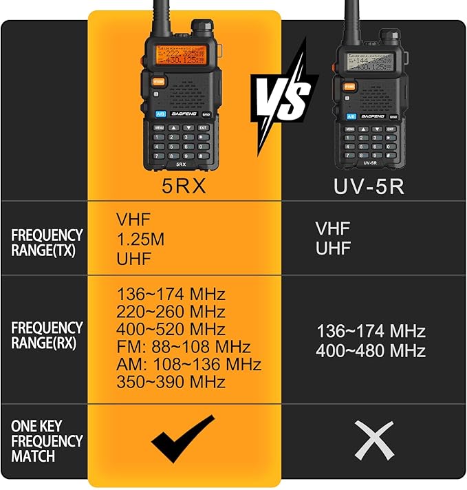 - Auto frequency finder and matching. The baofeng ham radio is an upgraded version of the baofeng UV-5R radio, has a one-touch frequency matching function. Convenient for you and your partner to set up quickly.