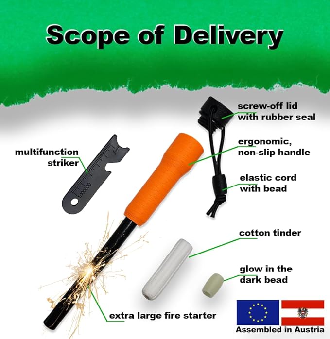 - Included Components : Elastic cord with lanyard bead and an additional glow-in-the-dark bead, Screw-off cap with rubber seal, Tinder material stored in the handle., Multifunction striker, Fire steel with a fiberglass-reinforced plastic handle Elastic cord with lanyard bead and an additional glow-in-the-dark bead, Screw-off cap with rubber seal, Tinder material stored in the handle., Multifunction striker, Fire… See more