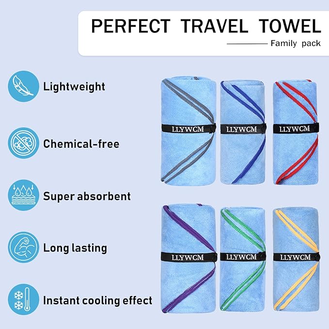 - UNIQUELY DESIGNED SET PACK: The high-quality waterproof towel set contains 6 microfiber camping towels and a separate mesh bag. The unique set pack design is convenient for your family or you and friends to choose between. Different seam marks on the edge of the towel make it easy to find the quick dry towel that belongs to you.