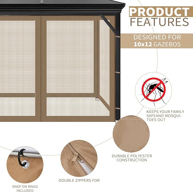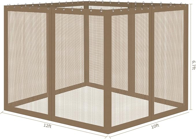 Gazebo Universal Replacement Mosquito Netting, 10' x 12' Outdoor Mesh Netting Screen 4-Panel Sidewall with Zipper for Patio Canopy Garden Porch Pergolas and Backyard, Khaki(Mosquito Net Only)