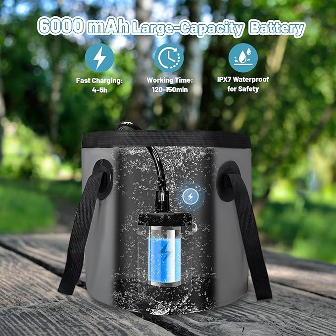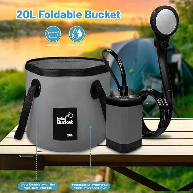Portable Camping Shower, 6000mAh Rechargeable Electric Shower Pump with 20L Foldable Bucket, Outdoor Shower Kit for Camping, Beach, Hiking, RV Travel, Pet Bath, Car Washing