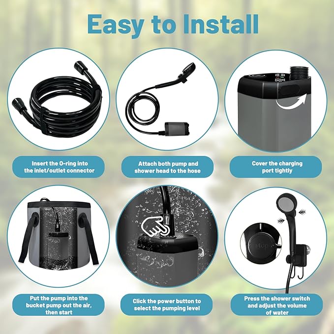 - 【Upgrade Shower Pump】 This portable camping shower is made of a reliable, durable and quiet motor, giving you a peaceful outdoor camping shower environment. The shower's bottom suction design with four suction feet on the bottom, which can be sunk under the water and hold the bucket firmly. Equipped with a PP element, it can filter out mud, dust, etc. from the water, addressing skin issues post-shower and easy to clean.