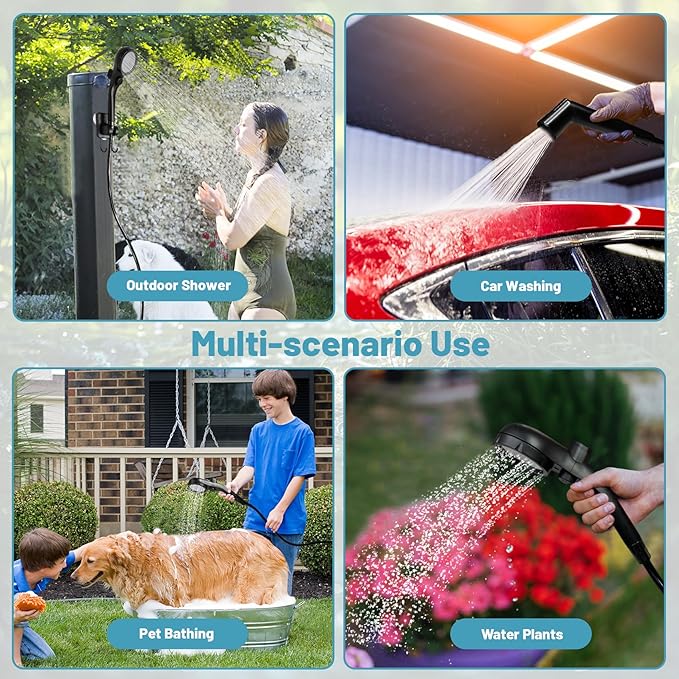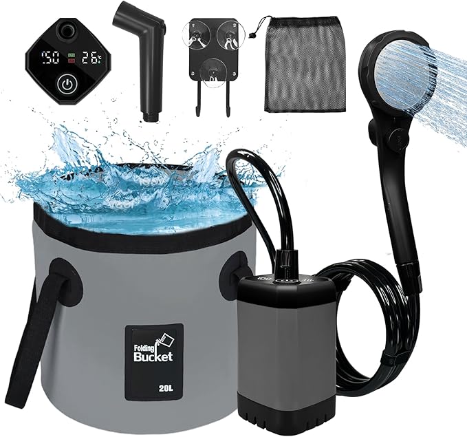 - 【Lightweight & Easy to Carry】 The camping shower kit includes 1* Multi modes shower head, 1* Spray gun head,1* Power water pump, 1* 6.7ft Water pipe, 1* 5 gal Foldable bucket, 1* Multi-use hook, 1* Type-C charging cable, and a Mesh organizer bag for convenient carrying and storage. Ideal for indoor/outdoor showers, camping, BBQ, hiking, beach, trips, bathing, pet bath, car washing, plant watering and more indoor outdoor use.