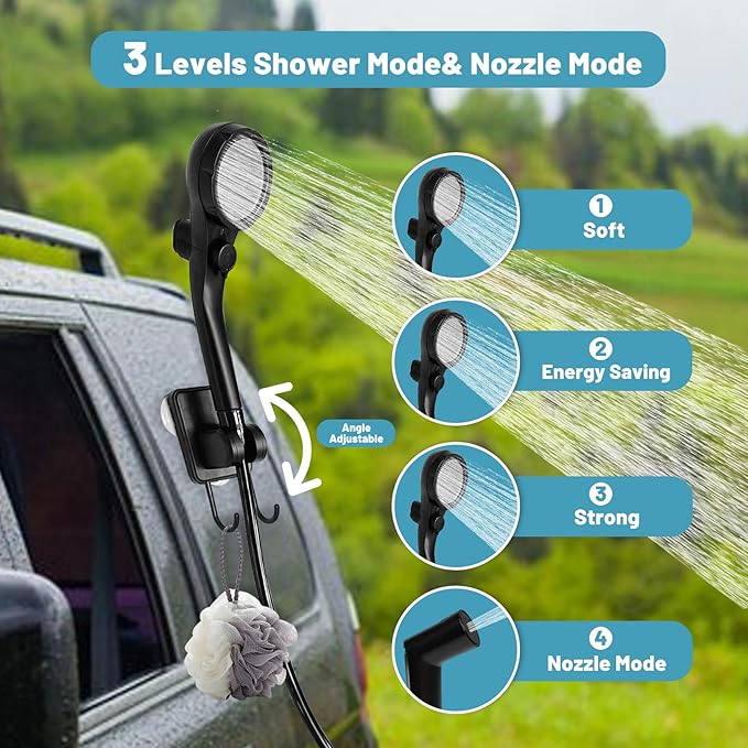 - 【Multi-Mode Shower】The portable shower head has three practical water dispensing settings, can easily switch between the different modes by rotating the handle of the shower head. Benefit from the adjustability of sliding bracket that shower head can be adjusted up and down for wider flow range. Bonus hook lets you hang it securely tree branch or tent stand. The included suction cups can secure the shower head to any smooth flat surface.