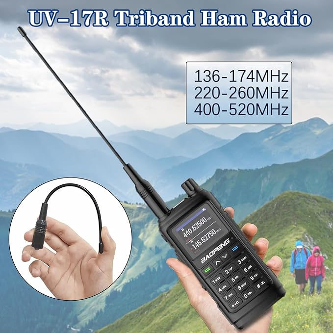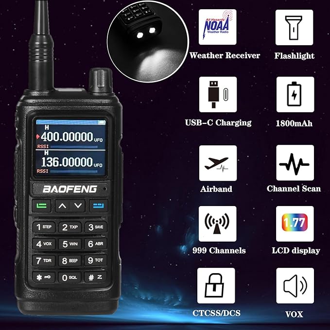 - Baofeng UV-5R Upgrade: Baofeng UV-17R is certified with FCC ID:2AJGM-UV17.Baofeng UV-17R walkie talkies is equipped with 1.77 inch LCD display, 1800mAh rechargeable battery, 999 channels, 104 CDCSS/50 CTCSS .Ham radios long range Support Multi-band: 144/220/430mhz, 1-9VOX, independent operation on A/B bands, NOAA Weather Receiver/FM/AM, support"CHIRP" .