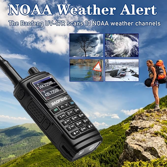 - NOAA Weather Alert: Baofeng UV-17R ham radio supports NOAA weather service and scans 10 NOAA weather channels, giving you plenty of time to respond to natural disasters. UV 17R becomes an ideal choice for outdoor adventures, field work, or large-scale events, ensuring that you are able to stay in good contact with your team members.