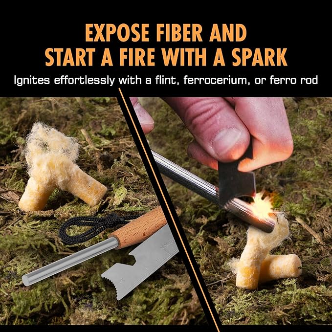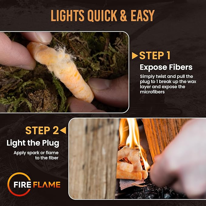 - BEST FIRE STARTER FOR CAMPING AND SURVIVAL - Crafted with high-quality cotton infused with premium paraffin wax this ignites swiftly with a flint, ferrocerium, magnesium, or ferro rod. Simply twist and pull the plug to break up the wax layer, exposing the microfibers. A spark on the exposed end will initiate a flame. its compact & lightweight, easy to carry, ideal for campers, hikers, hunters, and outdoor adventurers.