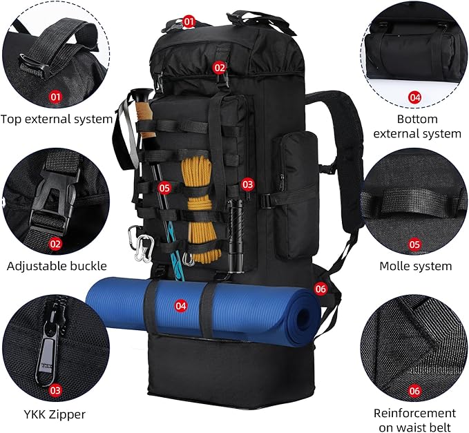 - 【Waterproof and Breathable Fabric】: The 100 liter backpack is made of 900D Oxford fabric and waterproof material. The Large Capacity backpacking bag thick density Tear Resisten Oxford cloth fabric is waterproof and wear-resistant, We include an additional rain cover, which effectively prolongs the backpack's usage time by protecting it from the elements.