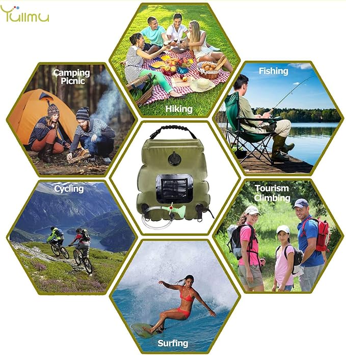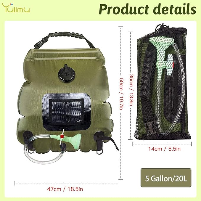 - 【Lightweight and Large Capacity】Our camping shower bag can carry up to 5 gallons/20 liters of water for outdoor showers, allowing you to enjoy a better and more refreshing shower anywhere. In addition, our portable shower bag can be easily folded and stored, which is very small and light, and you can conveniently put it in your suitcase, backpack or car trunk