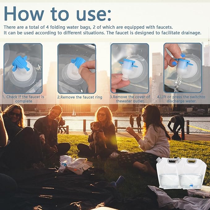 - Versatile Design: Our Outdoor Folding Water Bag comes in 4 pcs, 2 of which have nozzles for added convenience. The tap design facilitates easy water drainage, catering to various scenarios.