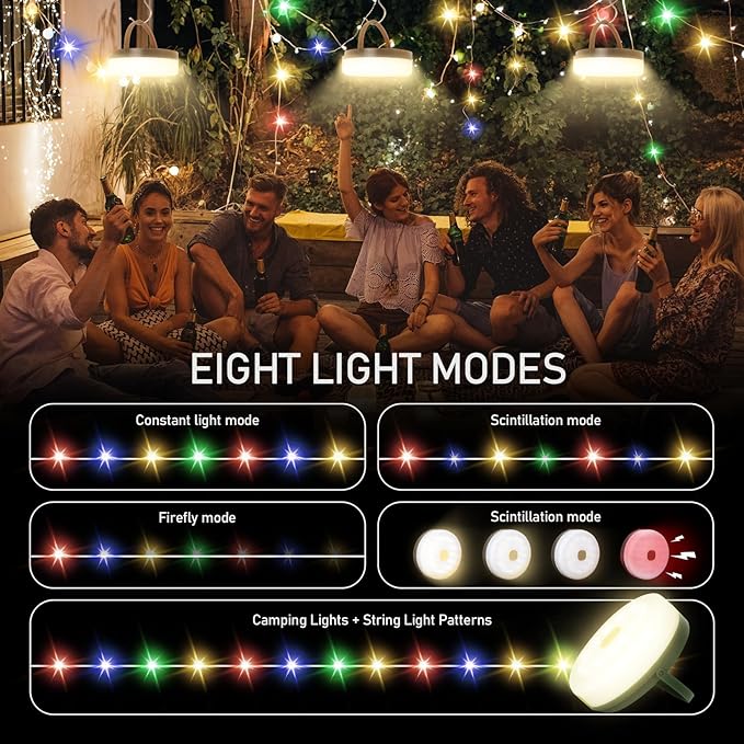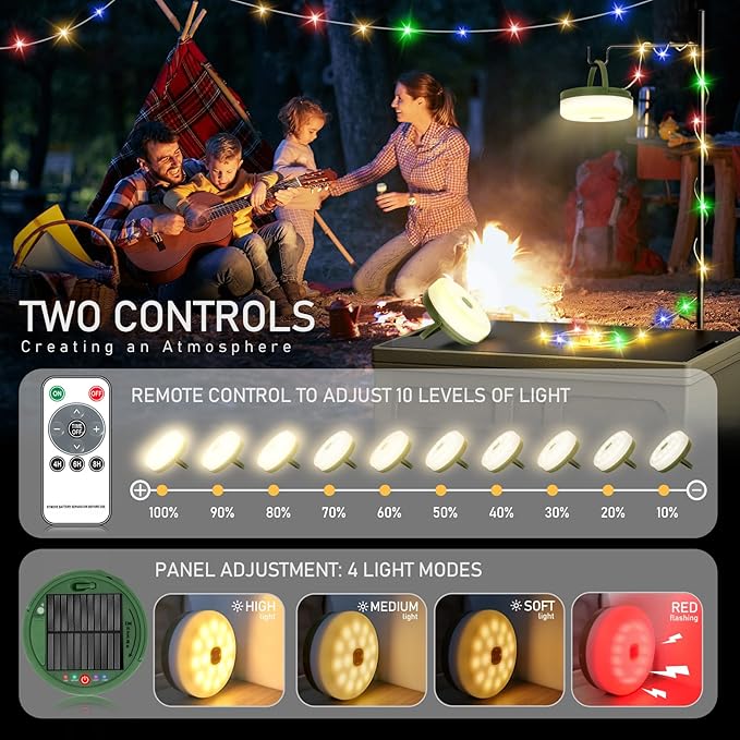 - Lighting Patterns and Adjustment Methods: LED portable camping light has 8 light modes,main light:white high light,white medium light,white low light,red light (S0S);multicolored light string:constant light,firefly mode,breathing light mode,light string+main light mode.Adjustment:main light button or use remote control to adjust remotely (5 meters),4H/6H/8H timer switch can be set.