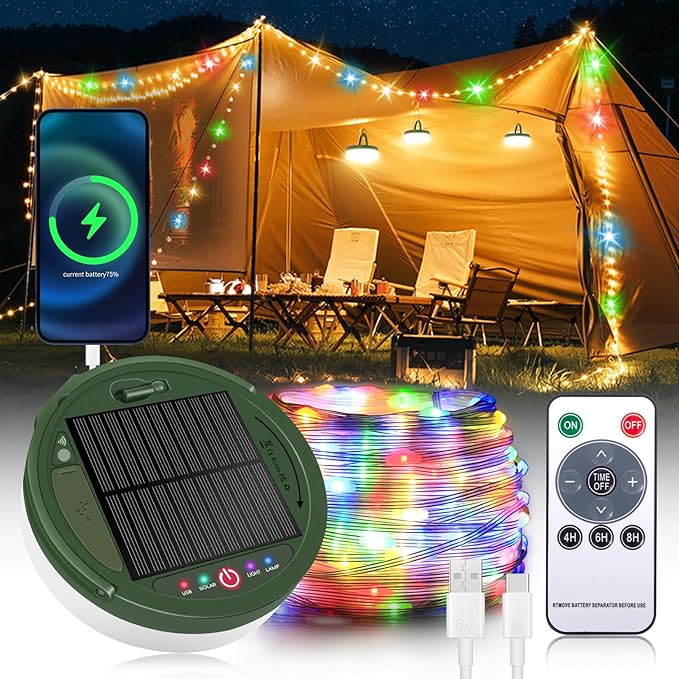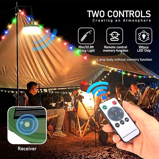 Camping String Lights,Solar Rechargeable Portable Outdoor LED String Light with Remote Control(39.4 Ft Multicolored Lights),Yard Tent Hanging Garden Party Festival Deco String Lights