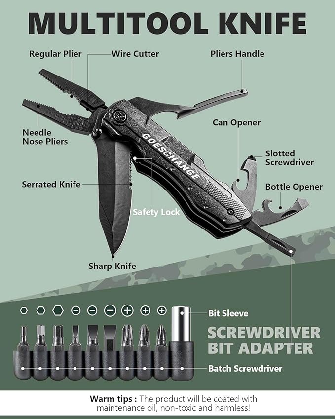 - 10-in-1 Multitool Set: Meet all your needs with this versatile tool set, featuring Needlenose Pliers, Regular Pliers, Wire Cutter, Serrated Knife, Can Opener, Slotted Screwdriver, Can Opener, Sharp Knife and multi kinds of Screwdrivers.