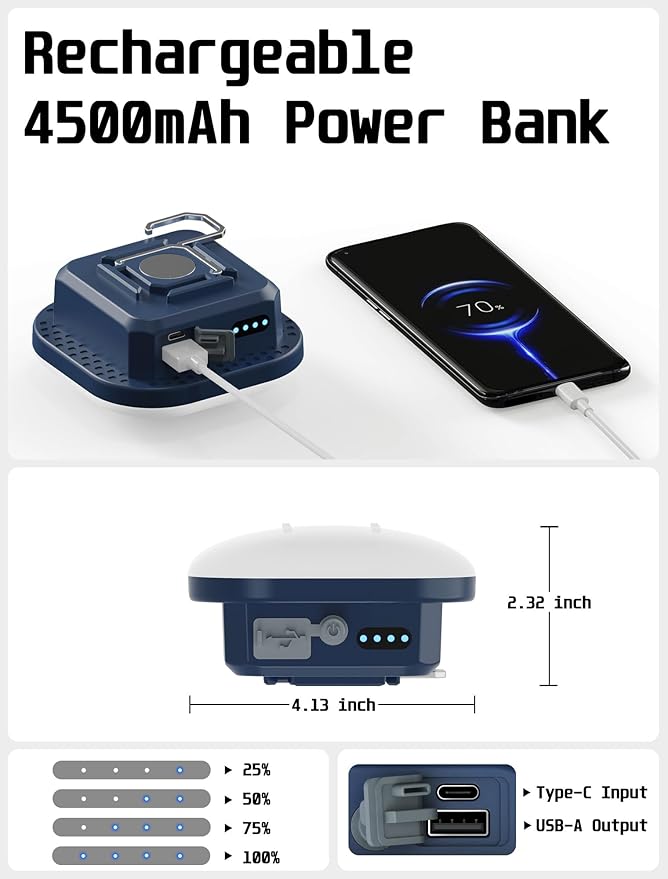 • [Rechargeable Battery and Portable Phone Charger]: 4500mAh Real capacity rechargeable battery allows this camping light running over 8 Hours in the highest Brightness setting, 60 Hours at Lowest Brightness. This camping lantern also can use as power bank for charging dead phone or power small device for emergency situation.