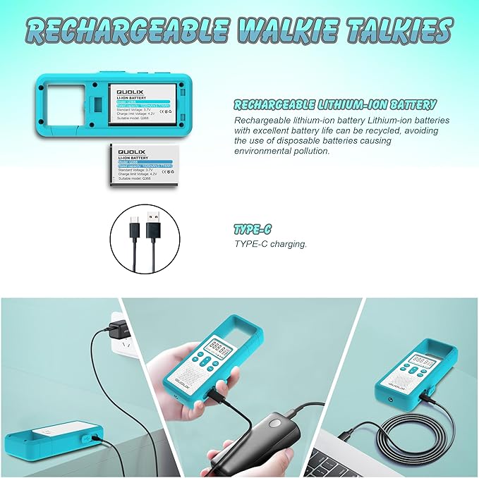 - 【Rechargeable】 Rechargeable walkie talkies support USB-C charging, you can charge it anywhere. You can save some money on disposable batteries.1100mAh lithium-ion battery lasts 5-6 hours.