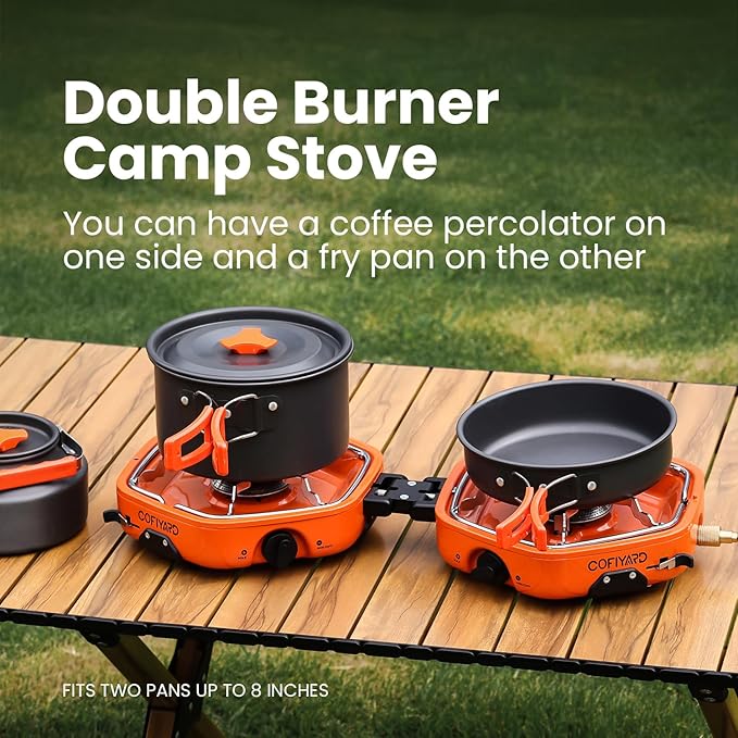 - Double Burner Camp Stove: The portable gas stove features a dual burner design with two adjustable burners. You can have a coffee percolator on one side and a kettle or fry pan on the other, providing versatility for your camp kitchen.