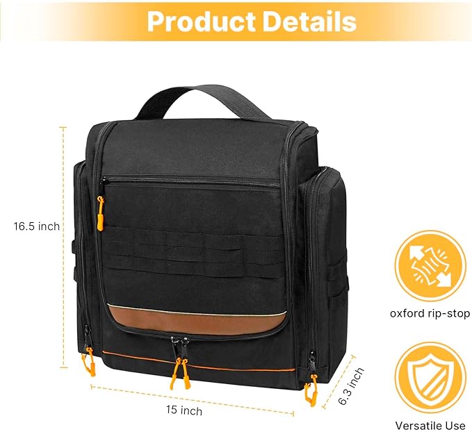 - Portable Camping Essentials: Hanging straps with secure buckle hang the bag on the RV awning, tent carrier or tree branch for easy access and to free up space on the camp table. The portable handles allow you to carry it anywhere.(Bag only, props not included)