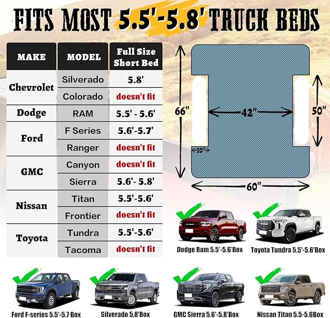 - FULL SIZE Truck Bed Mattress: This air mattress is only suitable for 5.5-5.8ft FULL SIZE pickup truck short beds. It is NOT for mid-size or long truck beds. Please make sure that your truck has a 5.5-5.8ft full-size short truck bed before buying.