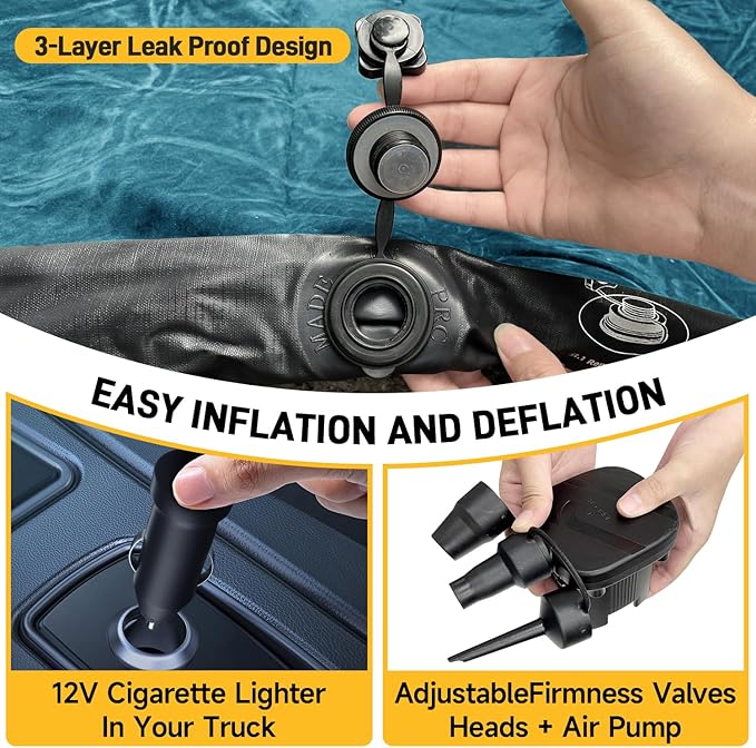 - High-Quality Materials: Our inflatable truck bed air mattress features a plush soft-flocked top surface, durable PVC construction for robust support, and upgraded 2024 extra-thick 210T grid fabric on the bottom to prevent punctures and air leakage, enhancing durability and reliability.