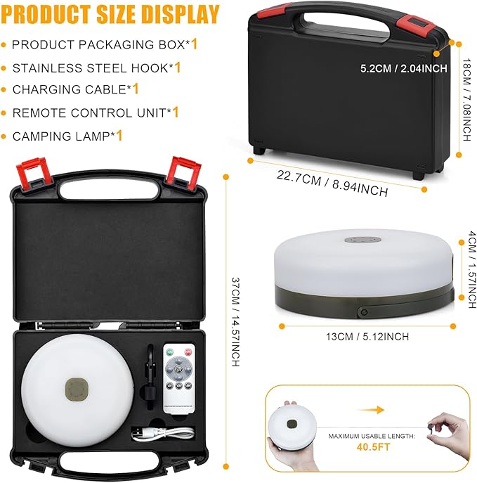 - CUSTOMIZED STORAGE CASE: Black organizer box with dedicated compartments securely holds the light, USB-C cable, remote control, and D-ring clips; Prevents tangling or damage during transport while keeping accessories instantly accessible for camping trips or emergency kits
