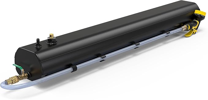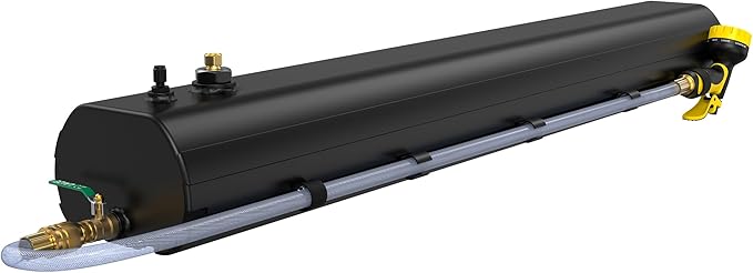 - [Large Capacity and Easily Pressure:] The Pressurized Water Tank is 55.11″long x 8.46″wide x 5.9″high, 33 lbs empty, 89 lbs full. Water tank holds 30L (roughly 8 gallon) water. You can use an air compressor(not included)to easily pressurize the tank, safely top pressurize not higher than 80 PSI
