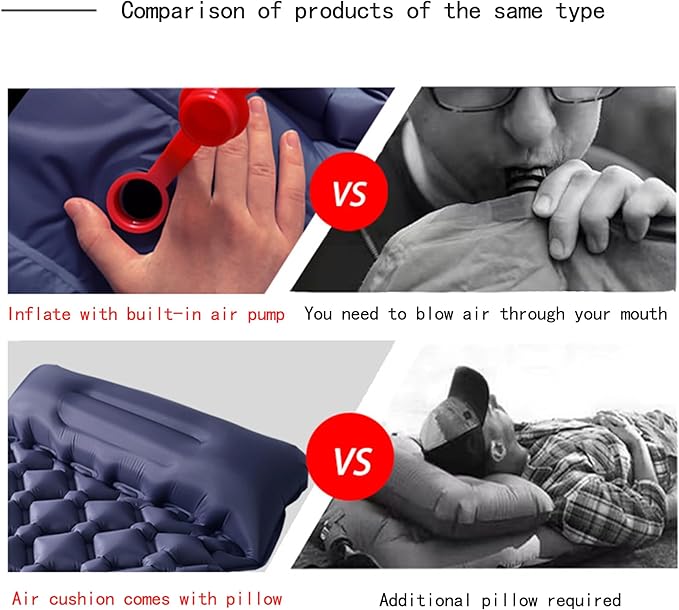 - Versatile Use: Suitable for various outdoor activities, such as camping, backpacking, or as an extra sleeping surface at home.Because inflatable mattresses are soft and comfortable enough, they can also be used as entertainment venues for children, lunch camping, or traveling with pets.