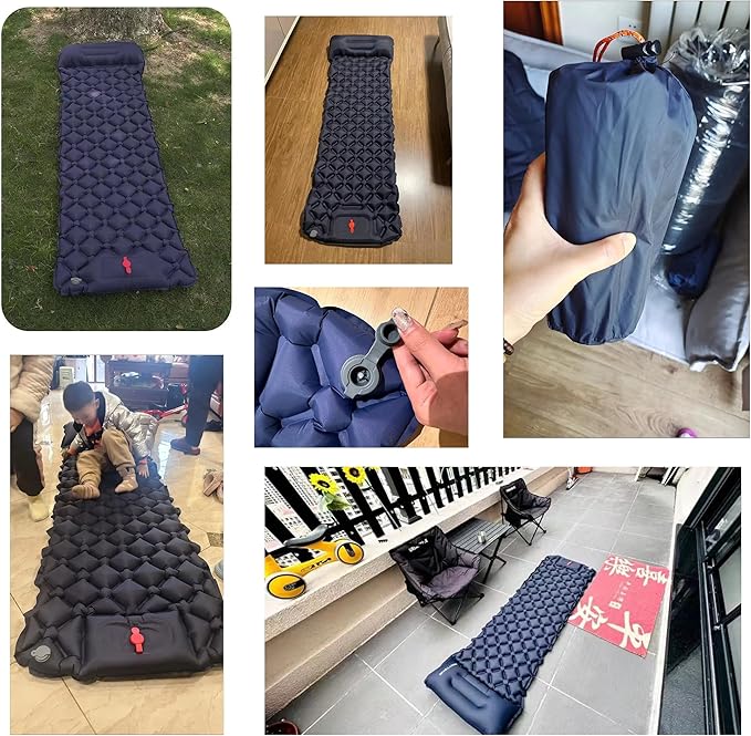 - Easy Inflation: Quickly inflate or deflate the sleeping pad using the included pump or valve.Only 30s Stomp to Inflate & 1s Deflate,This camping sleeping pad does not require you to purchase a pump or air filler alone. The foot part is equipped with a foot type air pump. Unlike conventional air filling methods such as electric air pump, manual air pump, and spray, it will be fully charged with a foot by pressing the air pump to complete the air. Women, children and the elderly are easy to complete and can be easily completed in minutes even with exhaust gases.