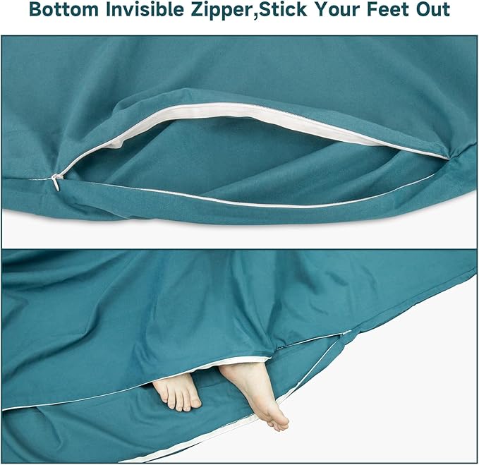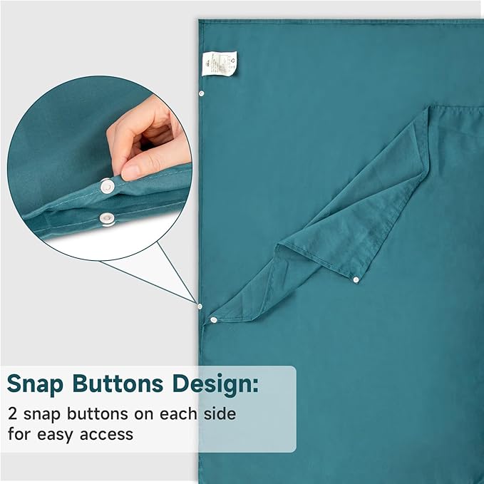 - Side Snap Fasteners and Bottom Zipper: There are 2 buttons on each side of the double sleeping bag for easy access. It can be opened on one or both sides, allowing you to get in and out of the sleeping bag liner easily. There is an invisible zipper at the bottom,you can unzip the bottom and expose your feet from the travel sheet.