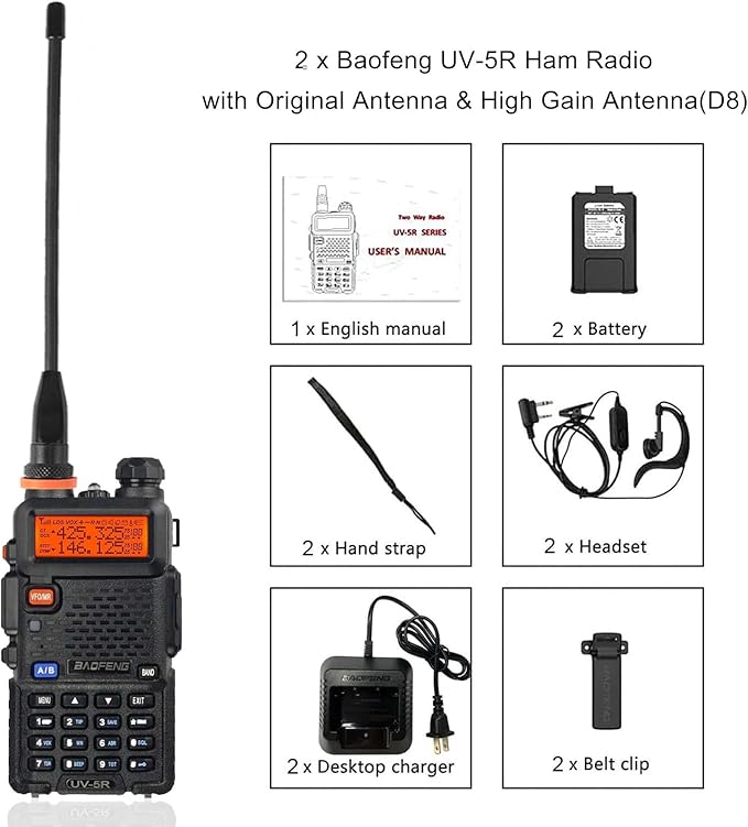 - Included Components : 2 x BAOFENG UV-5R radio with original antenna, 2 x High Gain Antenna(D8), 2 x 1800mAh Li-Ion battery, 2 x Desktop charger, 2 x Belt clip, 2 x Headset, 2 x Hand strap, 1 x English manual 2 x BAOFENG UV-5R radio with original antenna, 2 x High Gain Antenna(D8), 2 x 1800mAh Li-Ion battery, 2 x Desktop charger, 2 x Belt clip, 2 x Headset, 2 x Hand strap, 1 x English manual
