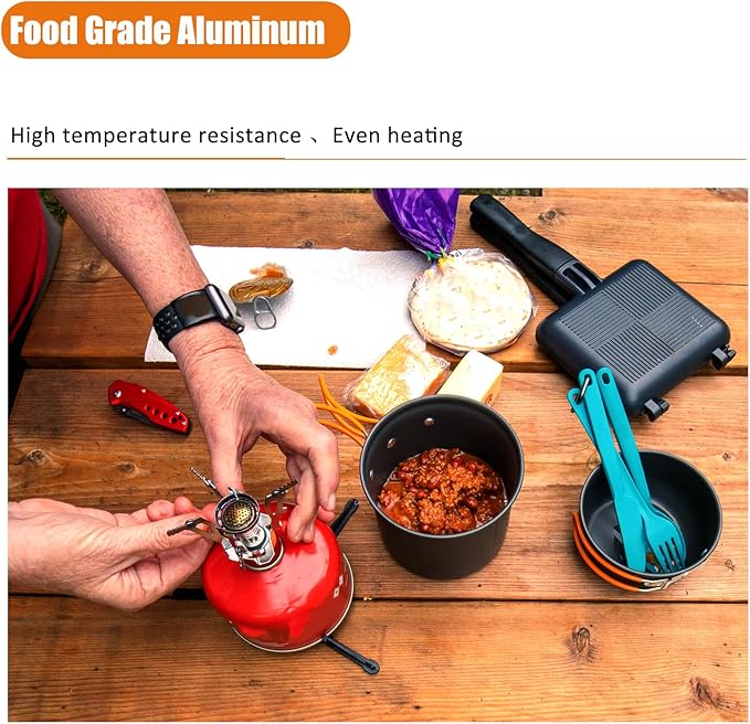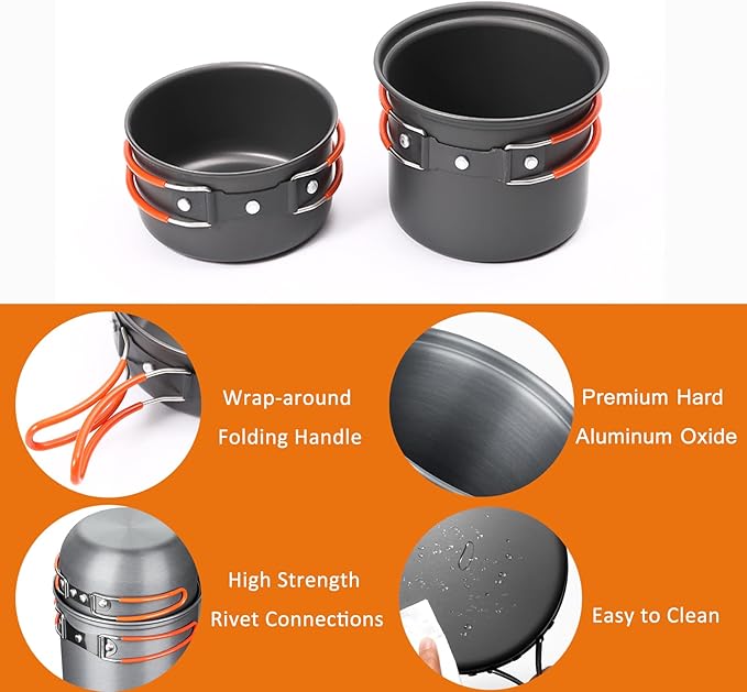 - 【High Quality Camping Cookware】Our Outdoor Cookware Set is made of the highest quality aluminum alloy. Fast heating, lightweight and corrosion resistance. The coating inside the pot ensures that the food does not stick to it and is easy to clean. Not easy to be scratched. It is a durable survival gear.
