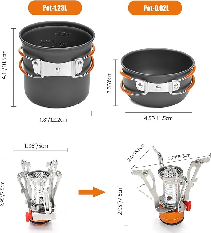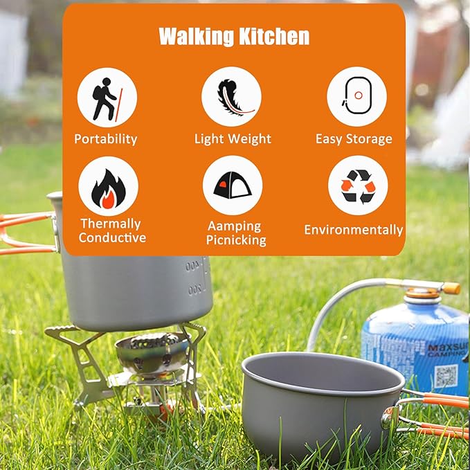 - 【 SAVE YOUR SPACE】Equipped with innovative foldable handles, our camping pot and pan set maximizes storage efficiency in its accompanying bag. The camp stove can also be folded to save space . Our camping pots and pans set weighs a mere 0.77lbs, making it effortlessly portable for backpacking and camping excursions.