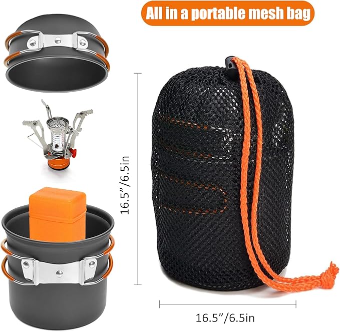 - 【Camp Cooking Kit with Stove】The 3pcs camping cookware mess kit includes 2 x anodized aluminum non-stick camping pot + 1 x mini backpack stove (no gas)+a mesh bag, total 14.8 oz. Walking "kitchen", can be packed into a backpack or travel bag, designed for 1-3 people.Compatible with any 7/16 threaded single butane/butane-propane fuel mix tank (EN 417). Camp stoves are not suitable for propane canisters (Note: fuel is not included).