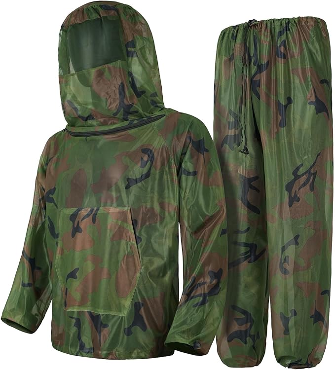 - Made of lightweight polyester fabric, the outside can be clearly seen through the mesh. This is a camouflage mosquito suit with high visibility, good breathability and ultra-fine mesh very suitable for outdoor Fishing, Camping, Hiking, Bee keeping, Climping and Gardening.