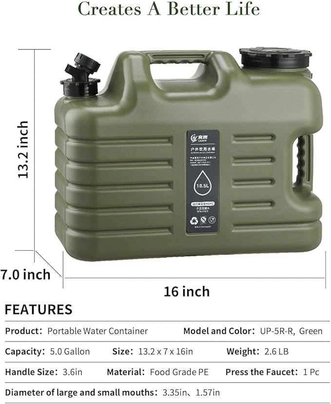 5 Gallon Water Jug,Thickened Water Storage Overlanding Gear Containers, Camping Essential Leak-Proof Green Portable Water Tank,BPA Free Outdoors Hiking