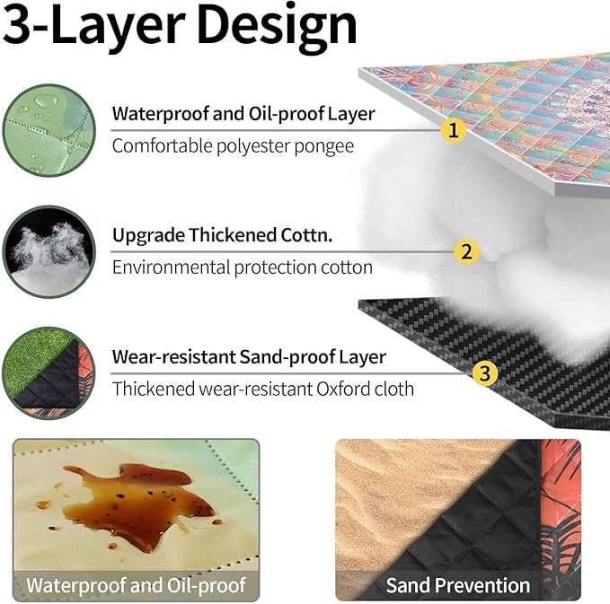 - 【Three-layer Structure】 We understand the importance of comfort and moisture resistance for outdoor activities. Therefore, the picnic mat adopts a three-layer design: the top layer is waterproof, the middle layer is soft cotton, and the bottom layer is also waterproof. This structure not only ensures the comfort of the cushion but also provides moisture resistance, allowing you to always enjoy a dry and comfortable sitting posture.