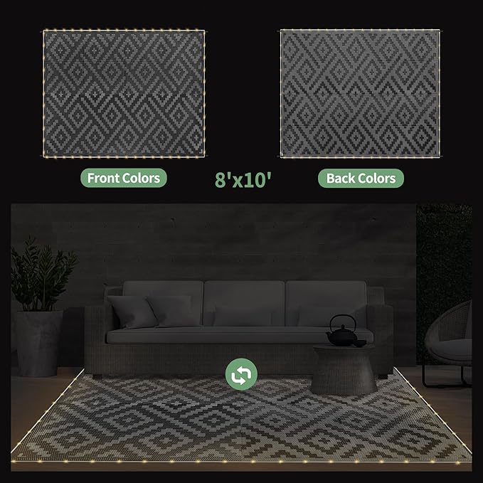 GENIMO Outdoor Rug with LED Strip Lights, 8'x10' Waterproof Camping Mat, Reversible Plastic Straw Rugs for Patio, RV, Camper, Balcony, Backyard, Picnic, Deck, Black & Gray
