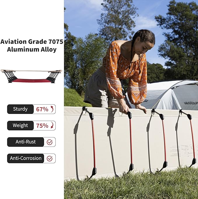 - 【STURDY & RELIABLE】The Camp Cot is made of aircraft-grade 7075 aluminum alloy, which is 67% stronger than ordinary aluminum alloy. The tent cot has a total of 5 support legs and can provide more support than 3 legs. It easily supports 330 lbs while keeping the bed flat and preventing it from sinking
