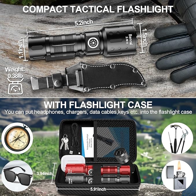 - 【PRACTICALLY INDESTRUCTIBLE TACTICAL FLASHLIGHT】Super bright led tactical flashlight shell is made of aircraft-grade aluminum alloy with excellent hardness, wear resistance, drop resistance water-resistant and an anti-slip finish. It is strong enough to withstand a 10 feet accident drop and even ran over by a truck, it still works!