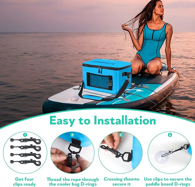 - 【Stable Attachment】 Four clips connect to your board's D-rings and extended elastic lanyards,and it is equipped with 4 transparent suction cups ensure a secure fit on your surfboard, kayak, or paddle board. The paddle board cooler remains steadfast even during rigorous water activities, letting you focus on enjoying your time on the water.