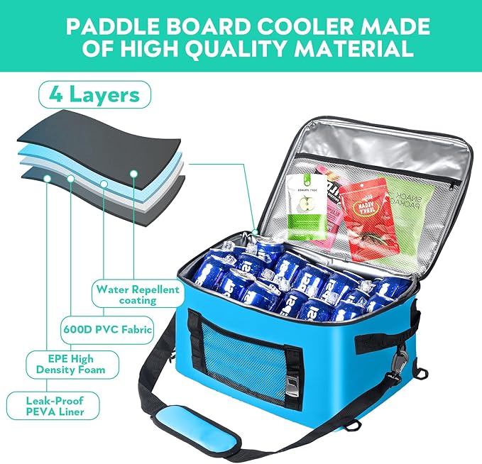 - 【Extended Chill for Drinks】Our paddle board cooler, crafted with high-density foam, premium insulating inner lining, and a waterproof exterior, offers lasting chill. Combined with water-resistant zippers, it ensures your drinks stay cool for longer during your water adventures.