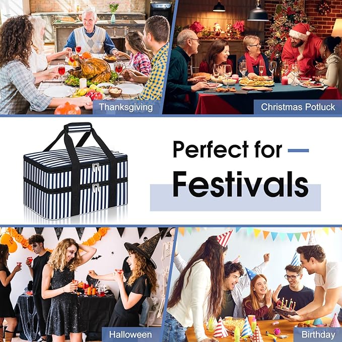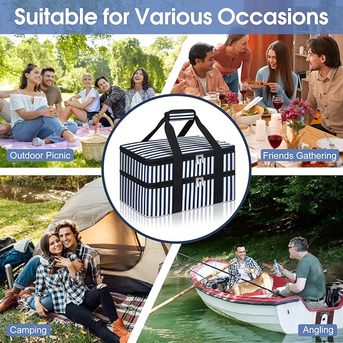 Double Insulated Casserole Carrier, Portable Casserole Carrier for Hot or Cold Food Lunch Tote Warmer or Cooler Bag, Lasagna Lunch Bag for Potluck Parties- Fits 9" x 13" Baking Dish-Blue Stripes