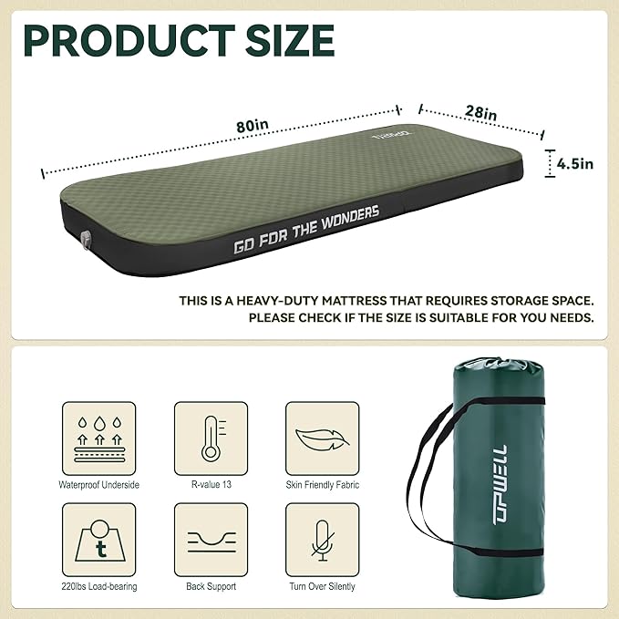 UPWELL Self Inflating Sleeping Pad 4.5" Thickness Camping Mattress with Solid Foam Single Sleeping Mat Portable Fast Inflation for Outdoor Mat Portable Roll Up Bed Green&Black