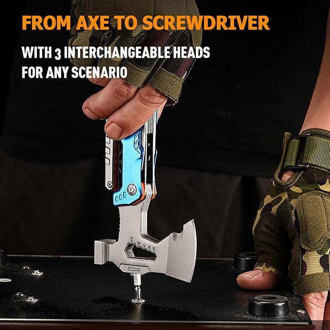 - 【Durability and Strength】: Our camping tools is engineered for exceptional durability, with every component crafted to endure heavy use. The tactical axe and hammer heads, made from high-hardness materials, remain sharp and reliable even under the toughest conditions. The pliers are equipped with high-quality alloy blades that can effortlessly cut through 3mm iron wire. With replaceable blades and serrated jaws for a secure grip, axe for camping is designed to be your reliable partner, ready to tackle any challenge.