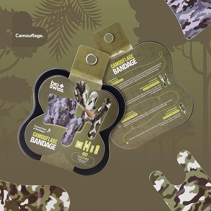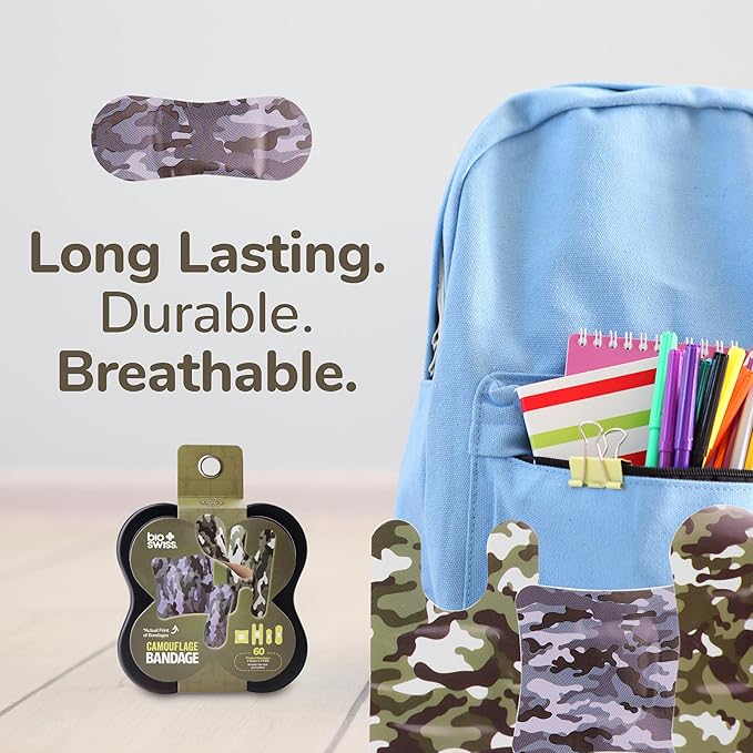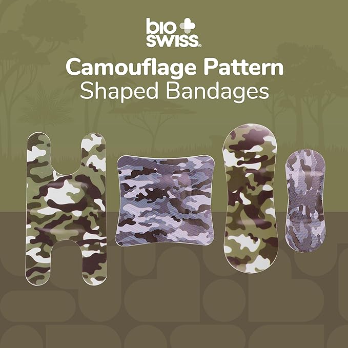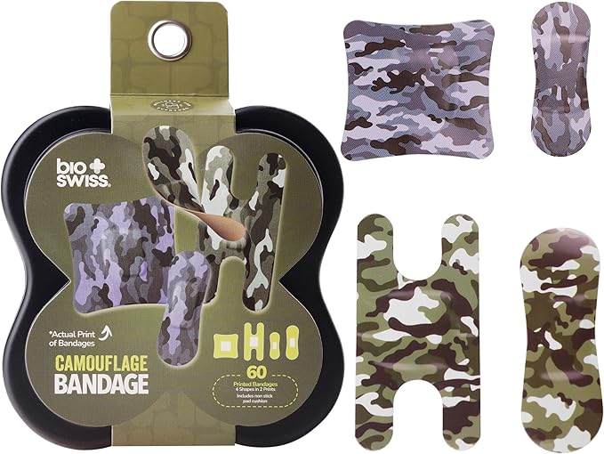 BioSwiss Bandages, Assorted Size Camoflauge Print Self Adhesive Bandage, Latex Free Sterile Wound Care, First Aid Kit Supplies for Kids and Adults, 60 Count