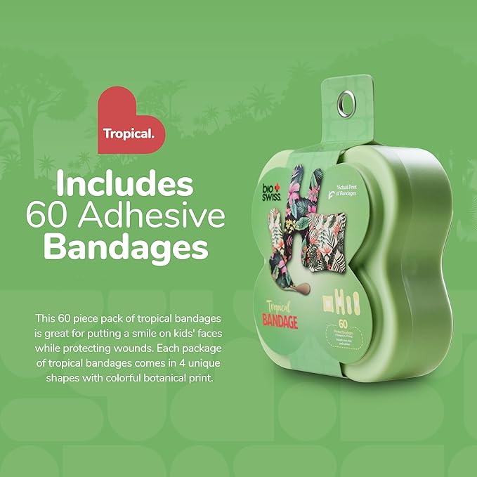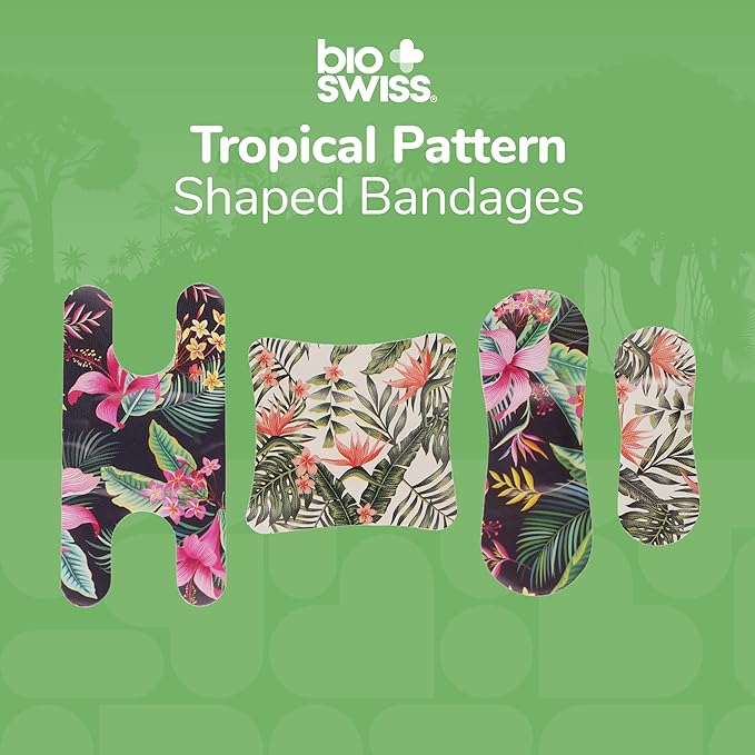 BioSwiss Bandages, Assorted Size Tropical Print Self Adhesive Bandage, Latex Free Sterile Wound Care, First Aid Kit Supplies for Kids and Adults, 60 Count