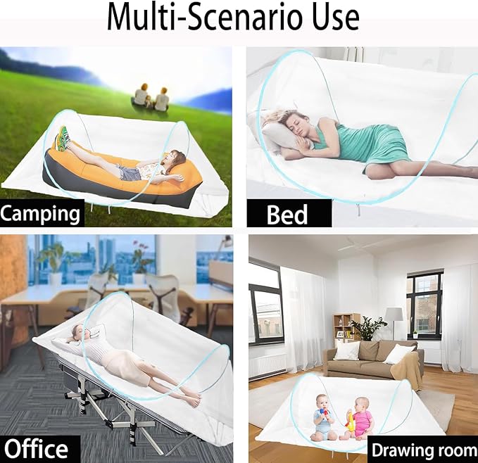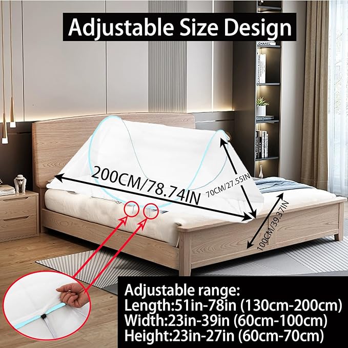 - Adjustable Size Design: This Mosquito net size is adjustable. The adjustable size range is L51-78 * W23-39 * H23-27 inch(130-200 * 60-100 * 60-70 cm). Adjustable design meets your different requirements for size. This mosquito net suitable for a single adult. Also,The mosquito nets are big enough for small children to play and sleep. Keeping you or your family a peaceful and relaxing night's sleep