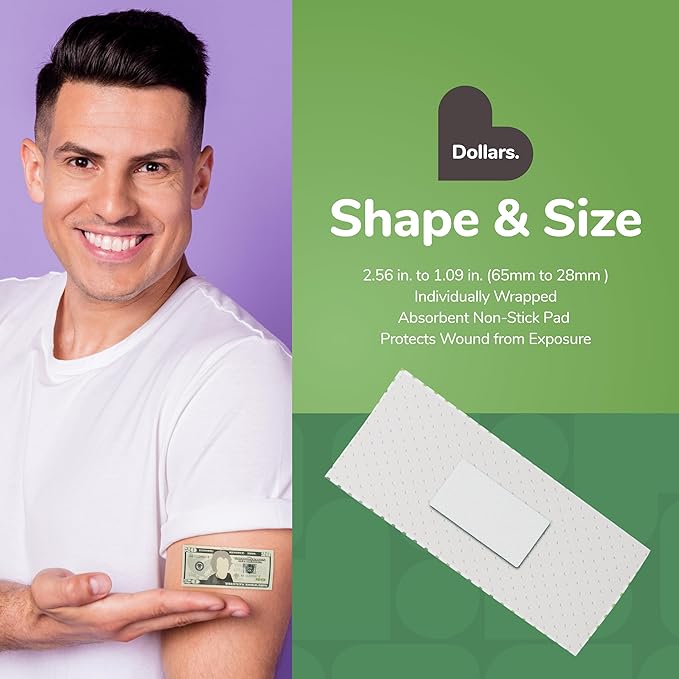 - MONEY BANDAGES: This 50 piece pack of adorable dollar bill shaped bandages is great for putting a smile on kids' faces while protecting wounds such as cuts, scrapes, and burns; sticky bandages are perfect for kids and adults alike, and also for school nurses and pediatric doctors