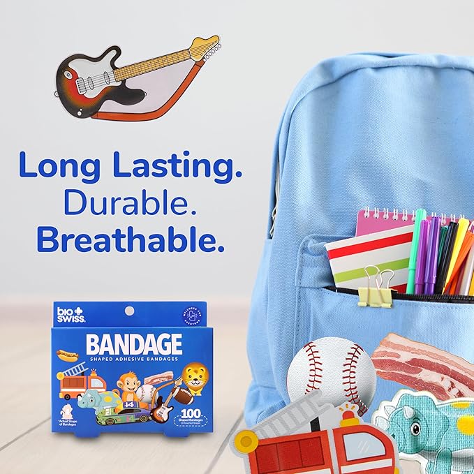 BioSwiss Bandages, Assorted Animal, Fun and Food Shaped Self Adhesive Bandage for Boys, Latex Free Sterile Wound Care, 100 Count